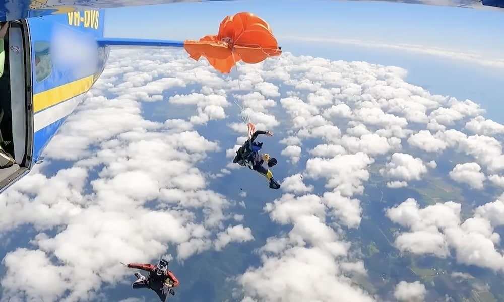 Laskuvarjohyppääjä selvisi kauhistuttavasta tapauksesta lievin vammoin ja onnistui laskeutumaan turvallisesti maan pinnalle. Kyseinen hyppääjä oli osa 17-henkistä ryhmää, jossa yksi toimi kuvaajana ja 16 muuta oli aikeissa tehdä muodostelman. Australian liikenneturvallisuusvirasto on julkaissut muutaman kuukauden takaisesta tapahtumasta virallisen raportin videon kera.